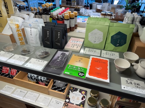待ち合い席から眺める日本国内で生産されている調味料の販売棚。